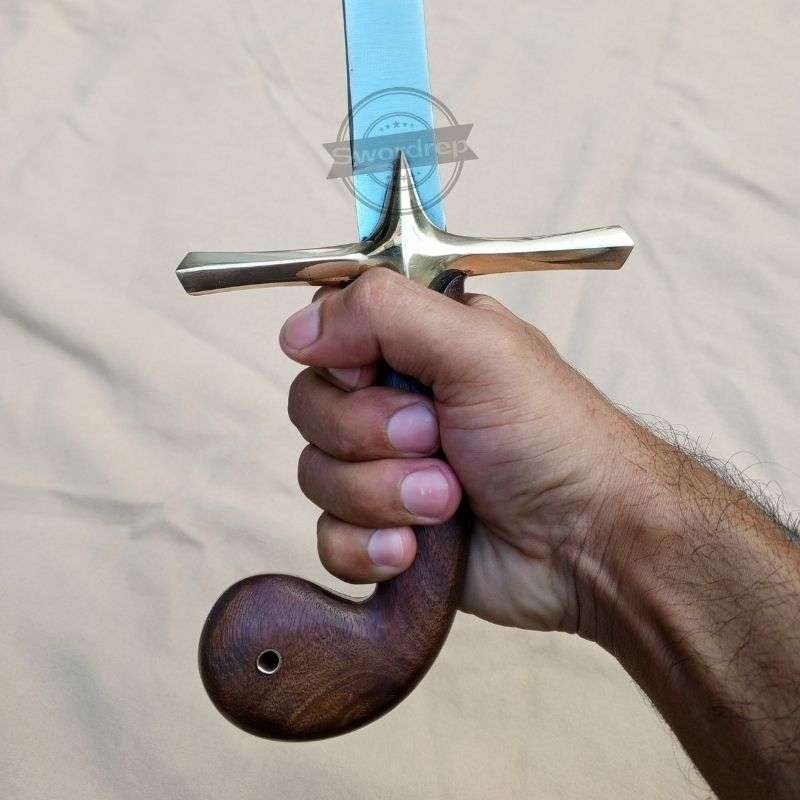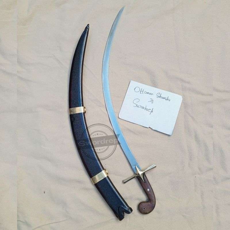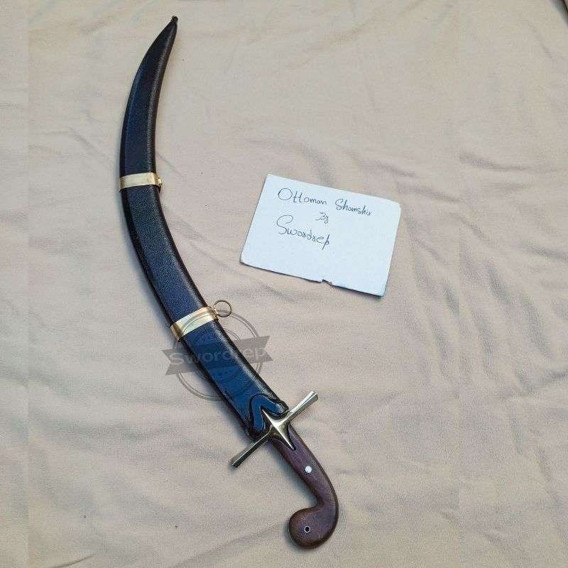 The Ottoman Shamshir is a curved Persian sword from the 18th century, known for its sleek design and impressive cutting power. With its distinctively curved blade, it was a favored weapon for cavalry, allowing swift, powerful slashes in battle. This shamshir with a late Ottoman hilt crafted by swodrep. Our shop can be found on Facebook, Ebay and Etsy as well. We makes swords that can be customised in many ways for a fantastic price. It is a heavily curved Ottoman Shamshir sword made of 1075 steel. The fittings are made of brass and the hilt is made of wood. It comes with a beautifully made wooden scabbard wrapped in brown or black leather with a touch of red. The scabbard is slender, which nicely fits the blade’s shape. It has a deep cut for smooth drawing and sheathing. When sheathed, the sword sits tight in its scabbard.